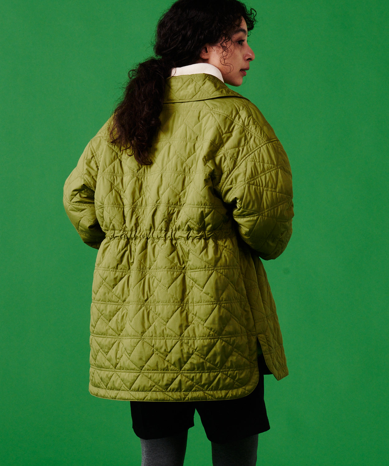 ドロップショルダーのシルエットで袖のボリュームがデザインのアクセントになっています。シャツカラーなのでスウェットはもちろん、フーディーとの相性も抜群。スカート・パンツ、どちらにもスタイリングしやすいキルティングアウターです。キャンプ、アウトドアはもちろん普段使いも◎